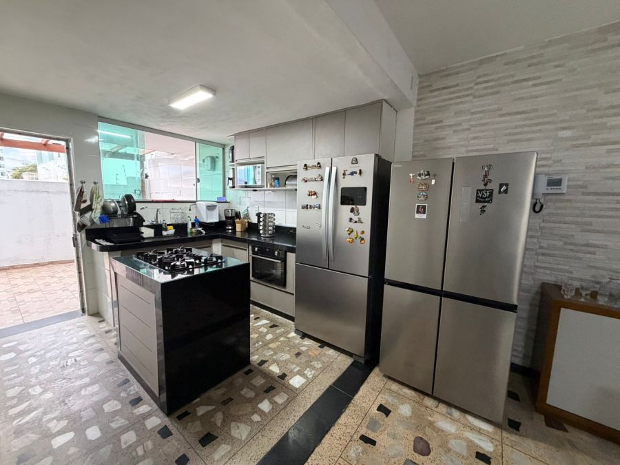 - Cozinha com banca em granito, ilha com fogão cook top toda montada nos armários planejados